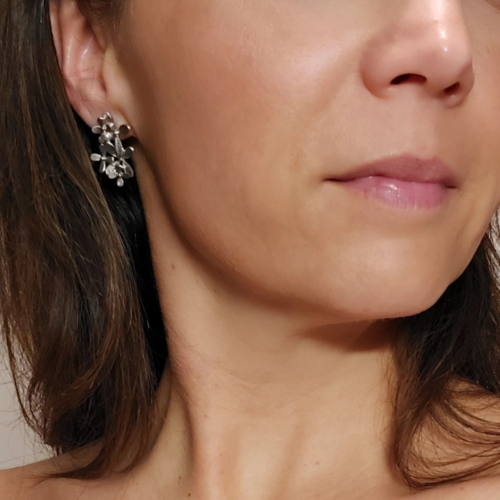 Tris sestavljajo trije cvetovi hortenzij. Oblikovalka si jih je zamislila kot viseče uhane in poskrbela za varovalno zapenjalo zadaj. Uhani niso primerni za športne aktivnosti. Uhani so izdelani iz srebra in so lahki za nošenje. Ker je oblikovalka ljubiteljica organskih tekstur, so cvetovi grobo matirani. S tem je ustvarila lesket kovine. Na voljo je le en par.
